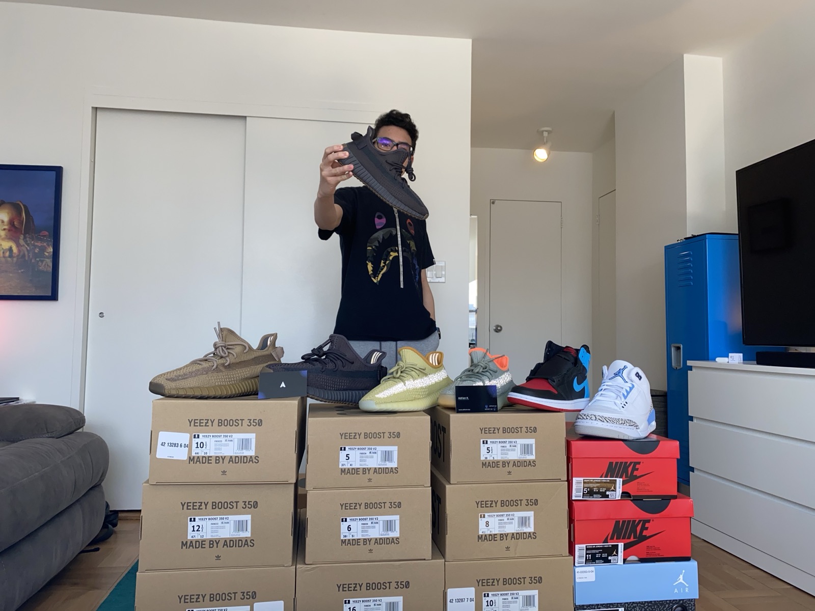 Peak sneaker reselling hit that spring. I was buying 20–30 pairs a week, all shipping to my apartment on the Upper East Side. To avoid getting flagged by retailers, we'd spoof the shipping addresses, intentionally scrambling them so no patterns could be detected. The side effect was kind of funny in hindsight: packages were constantly ending up at the wrong apartment. Neighbors were complaining, doormen were overwhelmed, boxes were stacking up in the lobby. I was 14, running a sneaker operation out of a New York City apartment building.